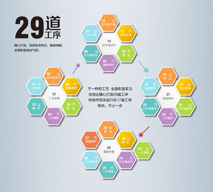 色彩統一 寶潤達擁有系統化的色彩控制方案 完美的原材料供應保障 40噸單缸產能 專業化的產品涂裝技術 |